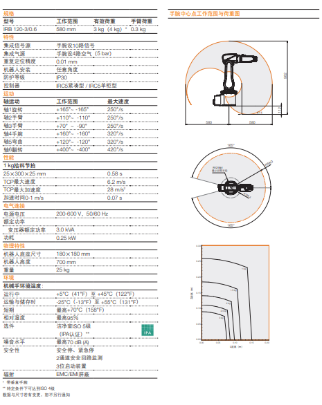 IRB 120广泛适用于电子、食品饮料、机械、太阳能、制 药、医疗、研究等范畴,进一步增强了ABB新式第四代机 器人家族的实力。 选用白色涂层的洁净室ISO 5级机型适用于高标准洁净生 产环境,开辟了全新应用范畴。 这款6轴机器人最高荷重3kg(手腕(五轴)垂直向下时为 4kg),工作范围达580mm,能通过柔性(非刚性)主动 化解决方案执行一系列作业。IRB 120是完成高本钱效益 出产的完美之选,在有限的出产空间其优势尤为明显。