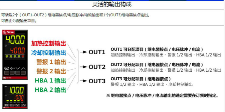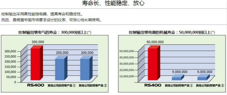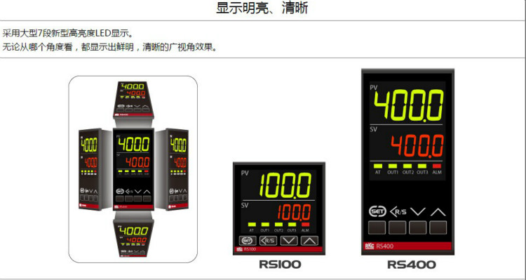 ・ 纵深 60mm ( RS100:63mm )的纤薄外形 ・ 采用大型7段新型高亮度LED显示。 ・ 可装载2个(OUT1-OUT2) 继电器接点/电压脉冲/电流输出和1个 ・ (OUT3)继电器接点输出。