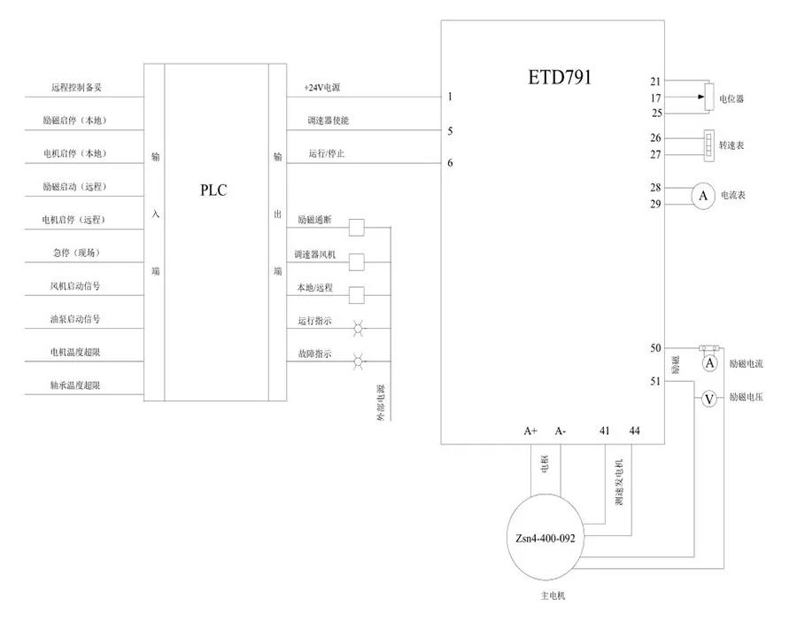 从图中可以看出,在回转窑的整个传动系统中,直流调速器是整个传动链中的驱动源,它控制着直流电机的运转,并根据生产工艺的要求时时调节电机转速,控制电机启停。 直流调速器厂家的性能决定着回转窑的运行状况,也决定着水泥生产的质量和产量。 ETD790系列直流调速器作为直流驱动领域的一个新的品牌,其技术性能、设计理念都站在了一个新的高度。采用了32位微处理器为产品核心,全数字控制方式,预测电流环控制算法,速度跟踪、力矩保持响应快,特别是其大容量产品的推出(可生产4000A的产品),更加符合水泥行业回转窑驱动的应用要求。 应用方案 由于回转窑的转动是单向的,在ETD产品中791是不可逆的,选择ETD791应用于回转窑的驱动中,通过对电压、电流、速度等参数的设置及模拟量、数字量输入/输出的控制,达到回转窑运行工艺的要求 我们在淄博某水泥厂二期工程招标中,以ETD产品具有的性能价格比优势,以完全满足回转窑运行要求为保障得以中标。并在实际应用中取得了成功,达到甚至超过其生产工艺中对回转窑运行的控制要求。 该项目中回转窑直径4.2米,长度64米,每小时烧制水泥200多吨,日产5000吨。 所选配电机为:ZSN4-400-092 630KW 电枢电压:660V 电枢电流:1006A 转速:1500r/min 励磁电压:180V 励磁电流:24.9A 。 此种型号电机是为水泥行业专门制作,特别适用于水泥回转窑的运转特性----启动时可具有2.5倍的过载能力,保证了较大的启动力矩。 ▲回转窑主驱动电机及减速箱 水泥厂在直流调速系统技术要求中明确规定直流调速器额定输出电压660V,电流2400A。且厂方最初的方案为用其他品牌两台1200A的调速器并联使用。我们在得知厂方项目需求后,对其技术要求进行了分析,了解其技术方案制定的初衷,其技术要求的目的在于以下几点:1、回转窑的窑体较大,加料后重量达1200吨左右,窑体启动时所需力矩较大;2、所选用直流电机为水泥行业专用电机,过载能力强,可承载2.5倍过流30秒钟;3、对直流调速器的性能及过载能力有较高的要求;4、厂方初定用两台1200A并联使用是基于无法提供单台2400A的产品。 通过将ETD791直流调速器的产品性能、规格、控制方式等各方面与初始方案进行比较,其在回转窑应用中具有以下优势:1、ETD791单机容量可到4000A,选用一台2500A的产品用于此项目中,解决用两台1200A并联使用带来的控制繁琐、隐患故障多的缺点;2、ETD791全数字化控制,先进的预测电流环控制算法,速度、电流跟踪反馈响应快,转速输出稳定,完全满足回转窑应用要求。3、提供多个数字、模拟接口可方便的与中控系统连接,进行远程控制。 回转窑的驱动控制方案 回转窑的运行控制,主要有启动、停止、速度给定、电枢电压电流输出、励磁电压电流输出。其运行中物料在窑内翻滚,造成负载状况时时变化,但要求转速波动越小越好。其启动、停止及运行又与外部其它多个条件互锁,互锁关系有:主电机冷却风机启停、主电机温度是否超限、轴承温度是否超限、润滑循环油泵启停等,每一个互锁点的状况直接或间接地与窑体的启停及运行相关联。 在调速器的外围增加PLC控制方式,将外部关联项与ETD791调速器的启停、运行、速度给定等通过PLC转换连接,完成互锁及关联关系。通过PLC完成与中央控制部分的连接,实现远程控制的功能。 控制原理图: