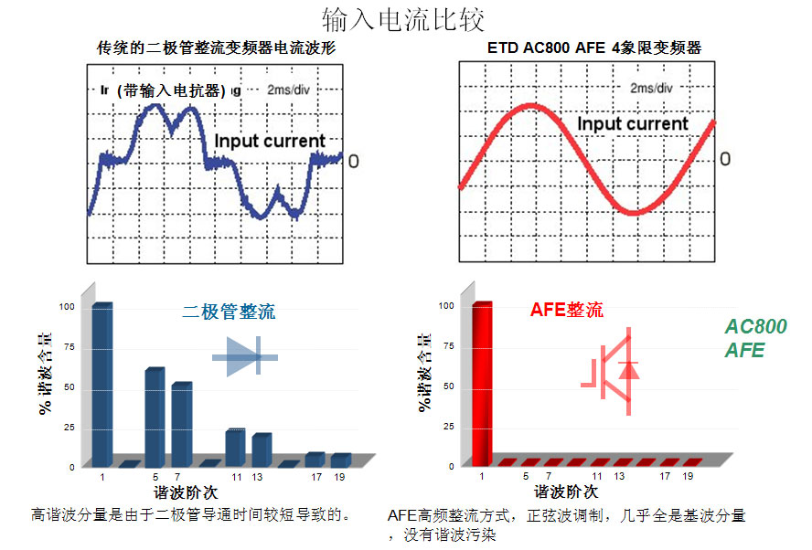 ■ 采用AFE主动前端整流技术的驱动系统,谐波可被忽略, 其大小不受电网质量或负载轻重影响,总的谐波不超过1%